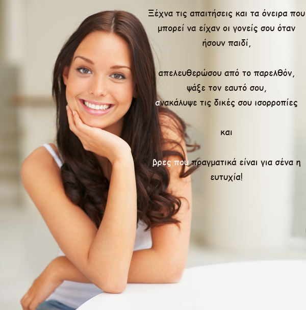 Ξέχνα τις απαιτήσεις και τα όνειρα που μπορεί να είχαν οι γονείς σου όταν ήσουν παιδί, απελευθερώσου από το παρελθόν, ψάξε τον εαυτό σου, ανακάλυψε τις δικές σου ισορροπίες και βρες που πραγματικά είναι για σένα η ευτυχία.