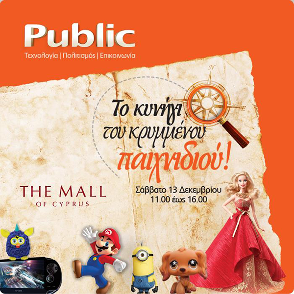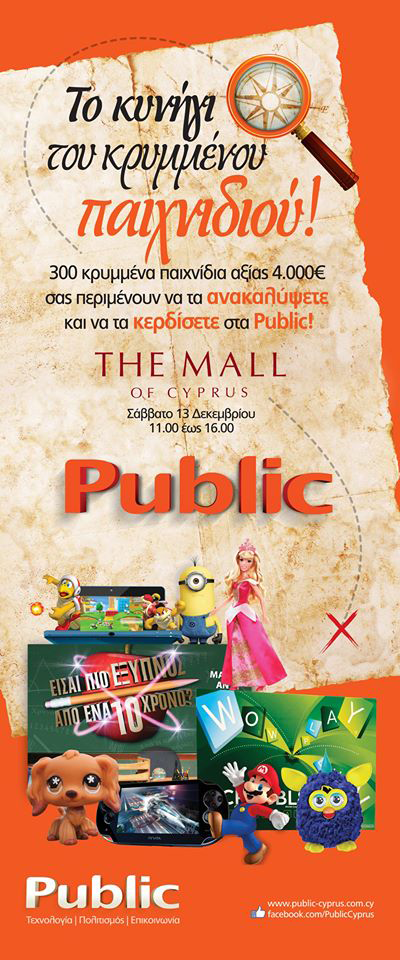 Τα Public κρύβουν αυτό το Σάββατο 13/12 στο The Mall of Cyprus 100 παιχνίδια αξίας 1.000 ευρώ και σας προσκαλούν να τα ανακαλύψετε και να τα κερδίσετε! Κούκλες, gaming, αυτοκίνητα, εκπαιδευτικά, μικρά και μεγάλα παιχνίδια σας περιμένουν εντελώς δωρεάν από τα Public, στο The Mall of Cyprus από τις 11πμ μέχρι τις 4μμ!