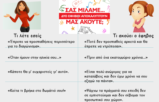 Οι περισσότεροι γονείς γνωρίζουν πως αυτό που λέει ένας έφηβος δεν είναι πάντα αυτό που εννοεί. Λίγοι όμως καταλαβαίνουν ότι αυτό που λέει ένας γονιός και αυτό που ακούει ένας έφηβος είναι επίσης δύο πολύ διαφορετικά πράγματα.