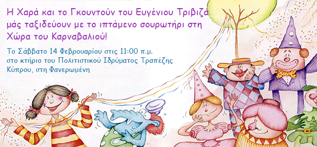 Η ανάγνωση του βιβλίου «Η ΧΑΡΑ ΚΑΙ ΤΟ ΓΚΟΥΝΤΟΥΝ. Οι τρεις αποκριάτικες κορδέλες» θα πραγματοποιηθεί στις 11:00 π.μ. στο κτήριο του Πολιτιστικού Ιδρύματος Τραπέζης Κύπρου, στη Φανερωμένη. Θα ακολουθήσει εικαστικό εργαστήρι για τη δημιουργία αποκριάτικης κορδέλας και μάσκες με τους αγαπημένους ήρωες παραμυθιών του Ευγένιου Τριβιζά, για παιδιά από 4-10 χρόνων από τις 12:00 μ.μ. μέχρι τη 1:00 μ.μ.