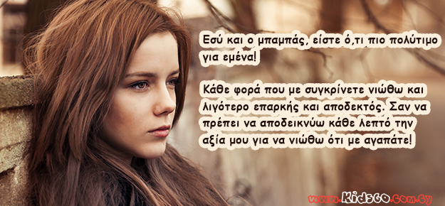 Κάθε φορά που είτε λεκτικά, είτε μη λεκτικά, με συγκρίνεις με το αδερφάκι μου ή με κάποιο άλλο παιδάκι, εγώ νιώθω χίλια κομμάτια. Νιώθω ότι πάντα πρέπει να βρίσκομαι σε μια μόνιμη υπερπροσπάθεια για να ανταποκριθώ στις προσδοκίες σου, οι οποίες κάθε φορά αλλάζουν.