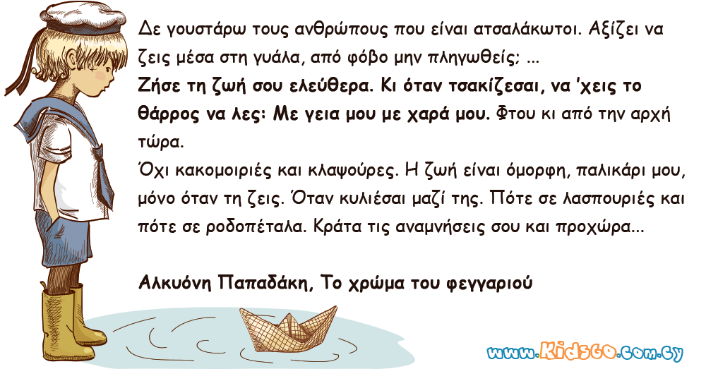 – Μην πικραίνεσαι, είπε. Και βούρκωσε. Είναι όμορφη η ζωή. Πίστεψέ με. Αξίζει να τη ζει κανείς, έστω κι αν κάποτε γεμίζει πληγές. Σε νιώθω. Λες να μην τα ξέρω όλ’ αυτά; Μα να θυμάσαι πάντα, φιλαράκο, πως αύριο ξημερώνει μια καινούρια μέρα. Δε σταματάει πουθενά η ζωή. Μη σε μπερδέψουνε κάτι κακομοίρηδες, που σφίγγουν σαν το παραδοσάκουλο την ψυχής τους. Κι ο άνθρωπος, σαν τα δέντρα είναι. Ανθίζει, κάνει καρπούς, μαδάει, και πάλι από την αρχή. Τώρα έχεις φουρτούνα εσύ, και δεν καταλαβαίνεις τίποτα. Φύλαξέ τα όμως στο μυαλό σου αυτά που ακούς. Δεν σου κάνω το δάσκαλο. Ένας γερο-ξεκούτης είμαι. Μα αυτά τα πράγματα έτσι γίνονται. Το ξέρω καλά. Αν θέλεις να φύγεις, φύγε. Κανείς δεν μπορεί να σε κρατήσει. Προχώρα όρθιος όμως. Έτσι;