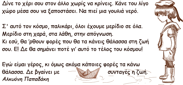 – Δίνε το χέρι σου στον άλλο χωρίς να κρίνεις. Κάνε του λίγο χώρο μέσα σου να ξαποστάσει. Να πιεί μια γουλιά νερό. Σ’ αυτό τον κόσμο, παλικάρι, όλοι έχουμε μερίδιο σε όλα. Μερίδιο στη χαρά, στα λάθη, στην απόγνωση. Κι εσύ, θα ’ρθουν φορές που θα τα κάνεις θάλασσα στη ζωή σου. Ε! Δε θα σημάνει ποτέ γι’ αυτό το τέλος του κόσμου! Εγώ είμαι γέρος, κι όμως ακόμα κάποιες φορές τα κάνω θάλασσα. Δε βγαίνει με συνταγές η ζωή. Άντε στην υγειά σου!