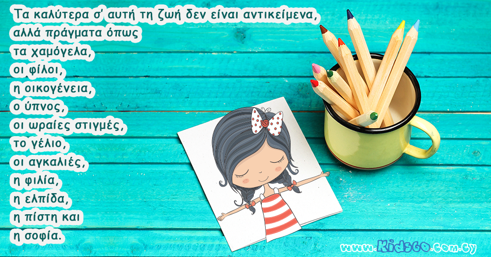 Τα καλύτερα σ’ αυτή τη ζωή δεν είναι αντικείμενα, αλλά πράγματα όπως τα χαμόγελα, οι φίλοι, η οικογένεια, ο ύπνος, οι ωραίες στιγμές, το γέλιο, οι αγκαλιές, η φιλία, η ελπίδα, η πίστη και η σοφία.