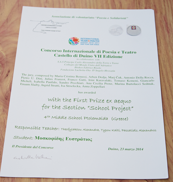 «Στη συνέχεια ήμουν στην αποστολή που ταξίδεψε Τεργέστη. Φοβερή εμπειρία. Ξεκινήσαμε από τη Θεσσαλονίκη και φτάσαμε αρκετά αργά στην Ιταλία. Ήμασταν τα τιμώμενα πρόσωπα σε μία μεγάλη βράβευση. Το έπαθλο ήταν μια πλακέτα που ανέφερε την νίκη μας και ένα χρηματικό έπαθλο, το όποιο δόθηκε μετά από κοινή απόφαση στον σύλλογο παιδιών με ειδικές ανάγκες Πτολεμαΐδας», αναφέρει και μου δείχνει φωτογραφίες από την εκδρομή. «Μεγαλύτερη εντύπωση μου έκανε η αρχιτεκτονική που χρησιμοποιούσαν στα κτίρια τους, καθώς είδαμε πανέμορφα κτίρια με υπέροχη θεά στη θάλασσα. Ήταν η δεύτερη φορά που ταξίδεψα στο εξωτερικό, καθώς πήγαμε πάλι στην Ιταλία πριν από λίγο καιρό στη Ρώμη, αλλά δεν συγκρίνονταν οι δυο πόλεις μεταξύ τους.».